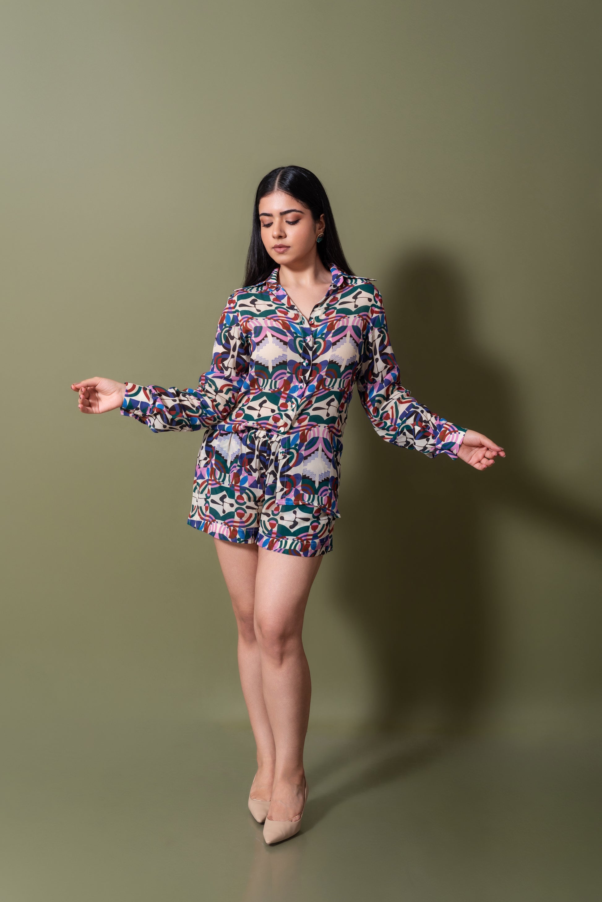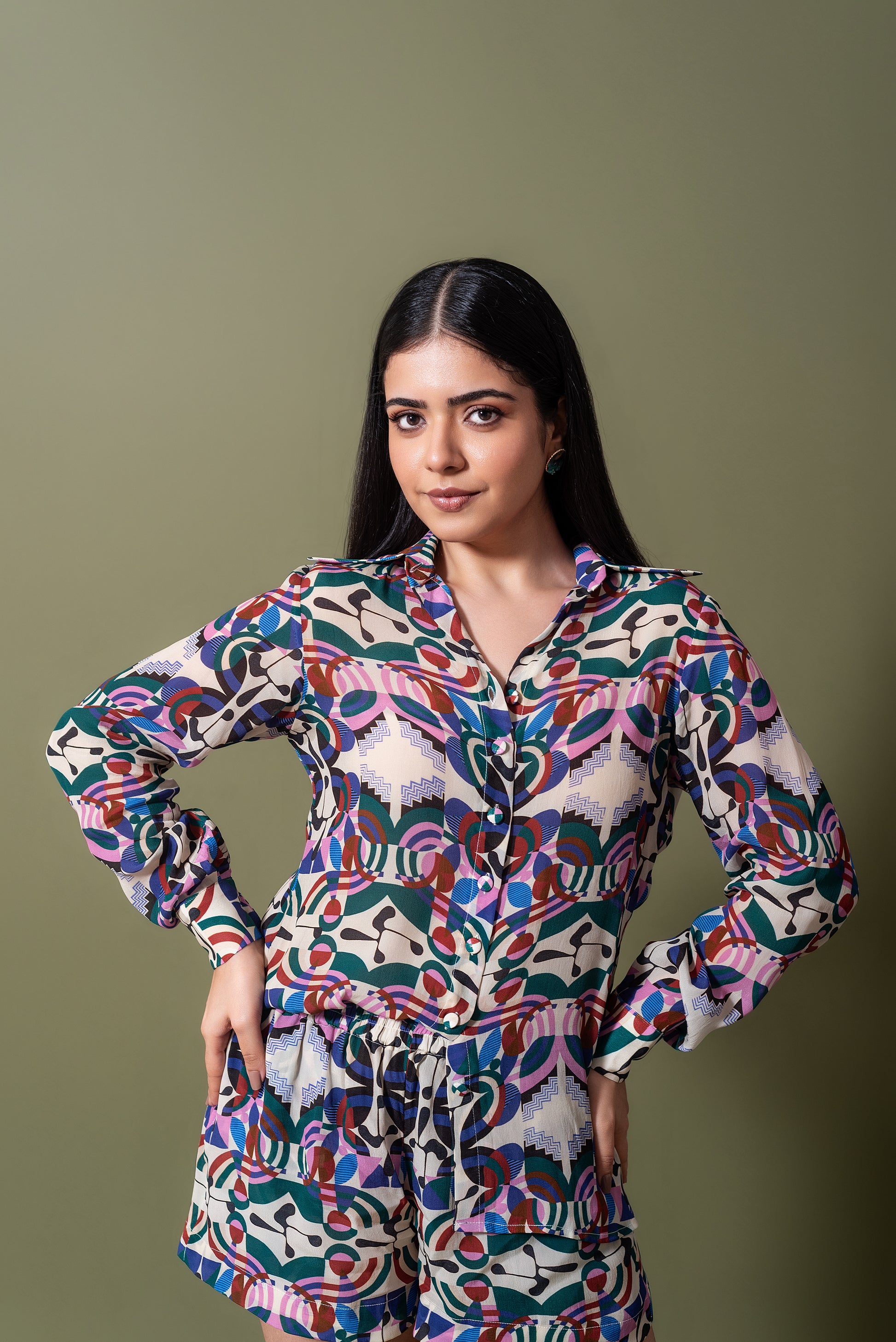 This bemberg crepe cord set adds a bold and geometric print to your wardrobe, perfect for day to night wear. The bemberg crepe material provides a luxurious feel, while the off-white color adds a touch of elegance. Elevate your style with this versatile and chic ensemble.