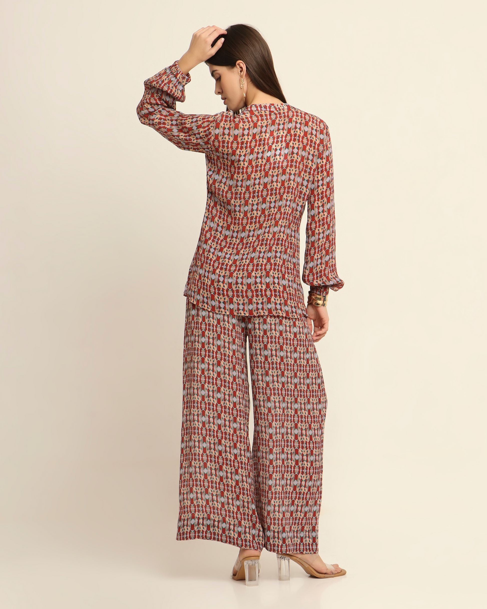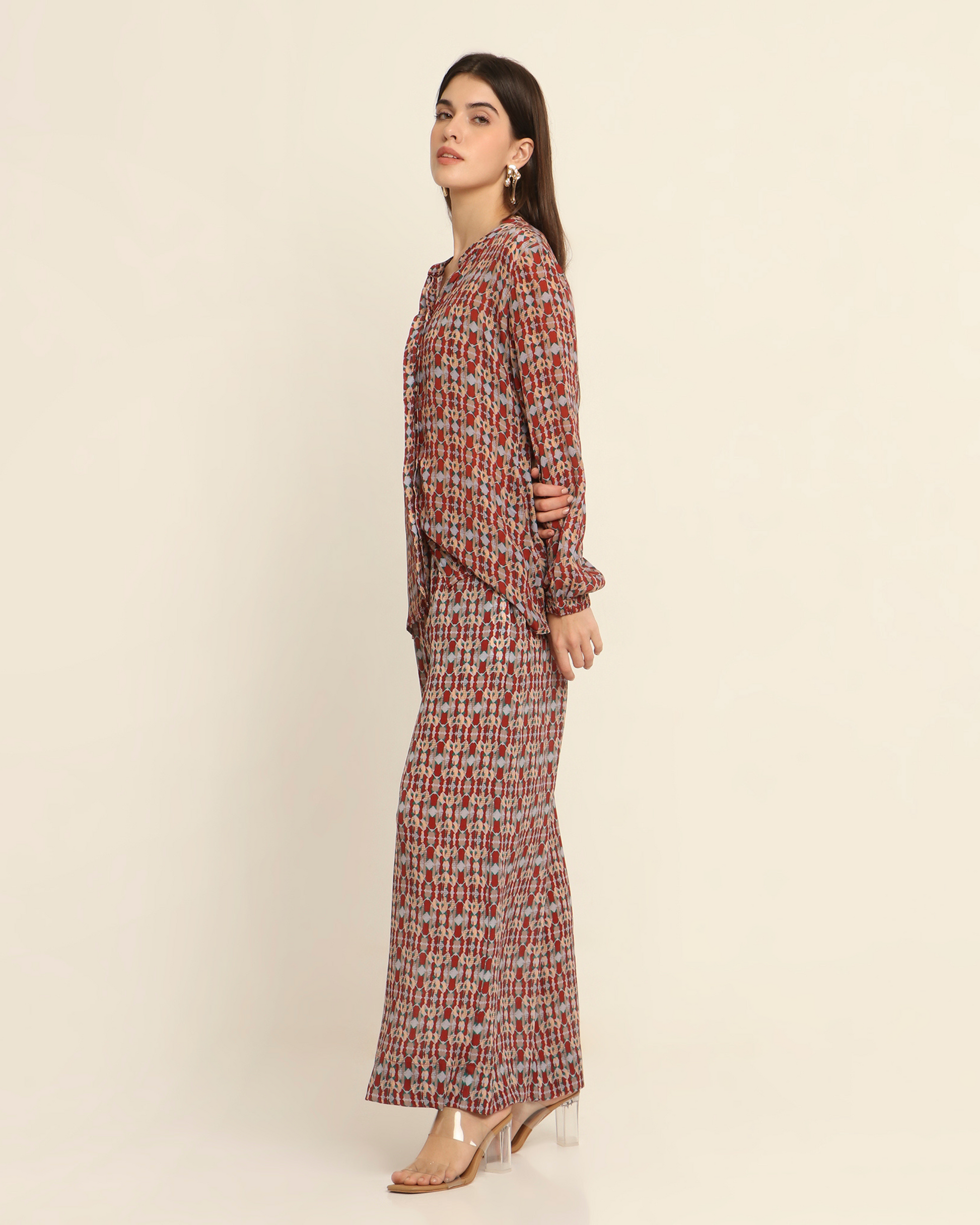 This bemberg crepe cord set adds a bold and geometric print to your wardrobe, perfect for day to night wear. The bemberg crepe material provides a luxurious feel, while the grey and maroon combination colour adds a touch of elegance. Elevate your style with this versatile and chic ensemble.