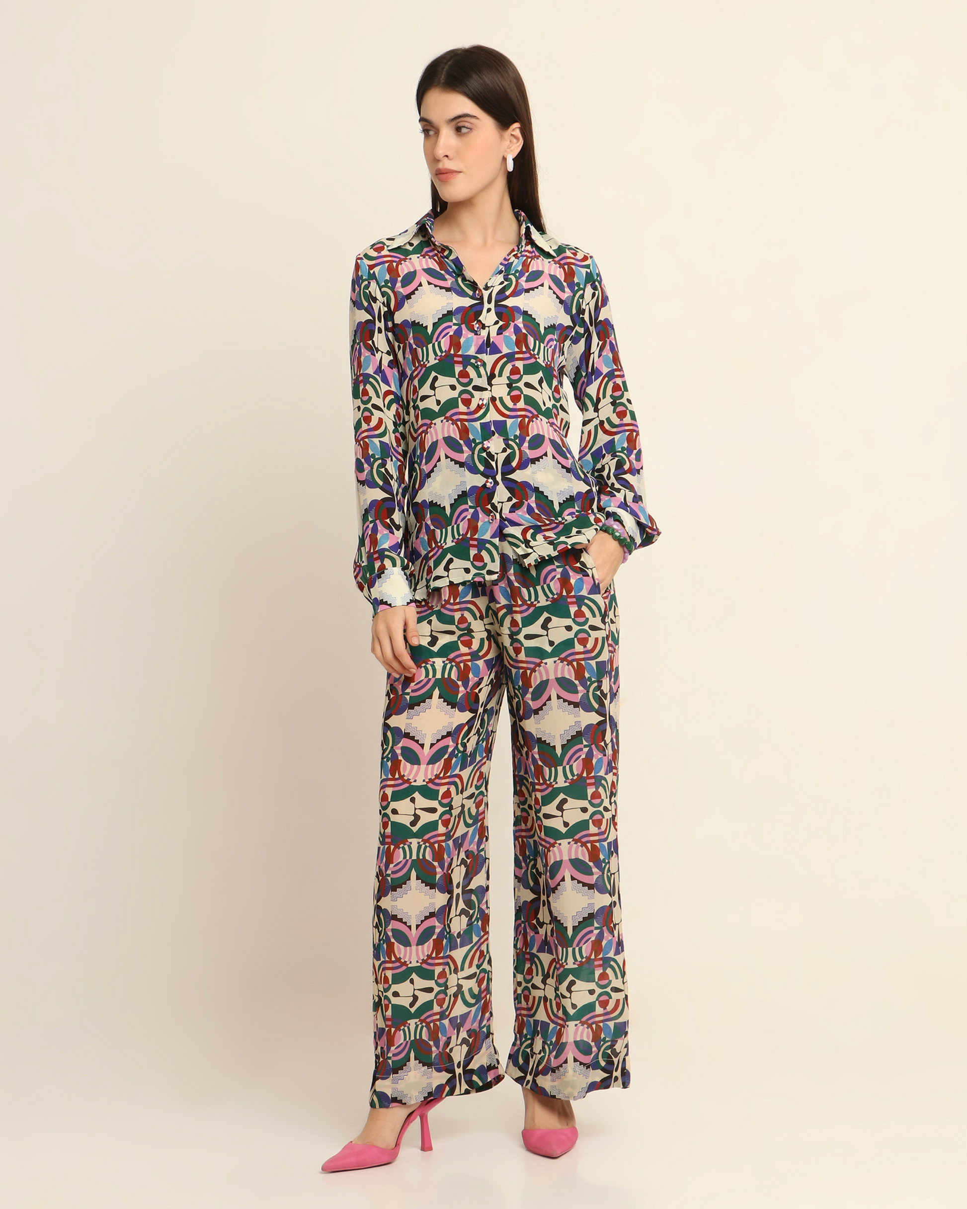 This bemberg crepe cord set adds a bold and geometric print to your wardrobe, perfect for day to night wear. The bemberg crepe material provides a luxurious feel, while the off-white colour adds a touch of elegance. Elevate your style with this versatile and chic ensemble.