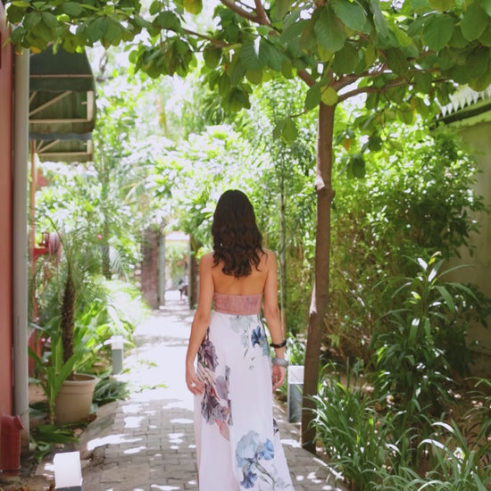 The fitted halter-neck bodice in a warm blush tone gently sculpts the upper silhouette, while the voluminous printed flare flows with ease, adorned with soft pastel prints. Lightweight, airy, and refined, this dress is ideal for day soirées, holiday escapes, or modern summer celebrations.