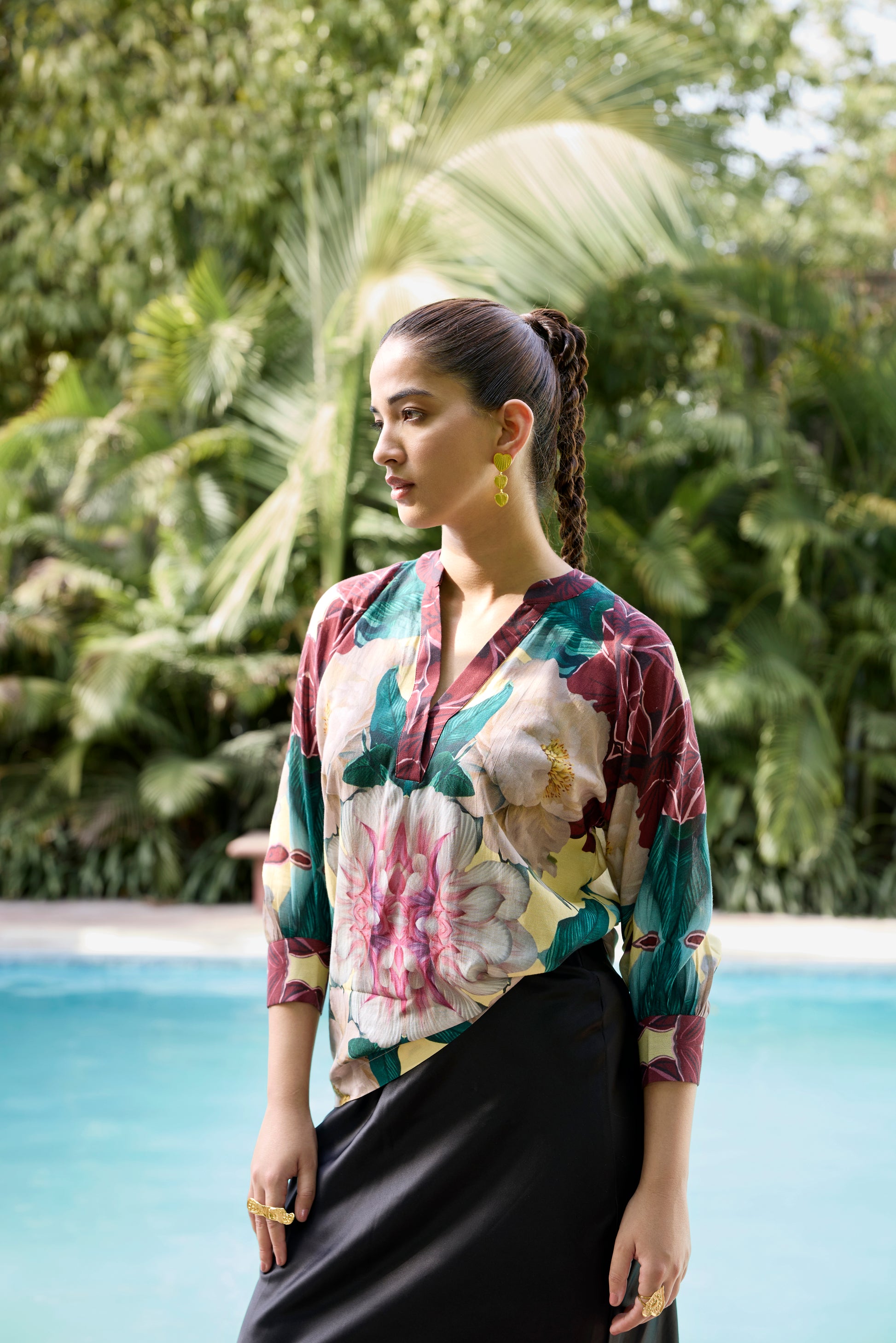 The V-slit neckline and soft, relaxed silhouette make it effortlessly chic, while the full-length sleeves are gently gathered at the cuffs for a graceful finish. This piece offers breathability and movement — perfect for tropical days or dressed-up evenings. Designed to transition seamlessly from resort lounging to an elevated city look.