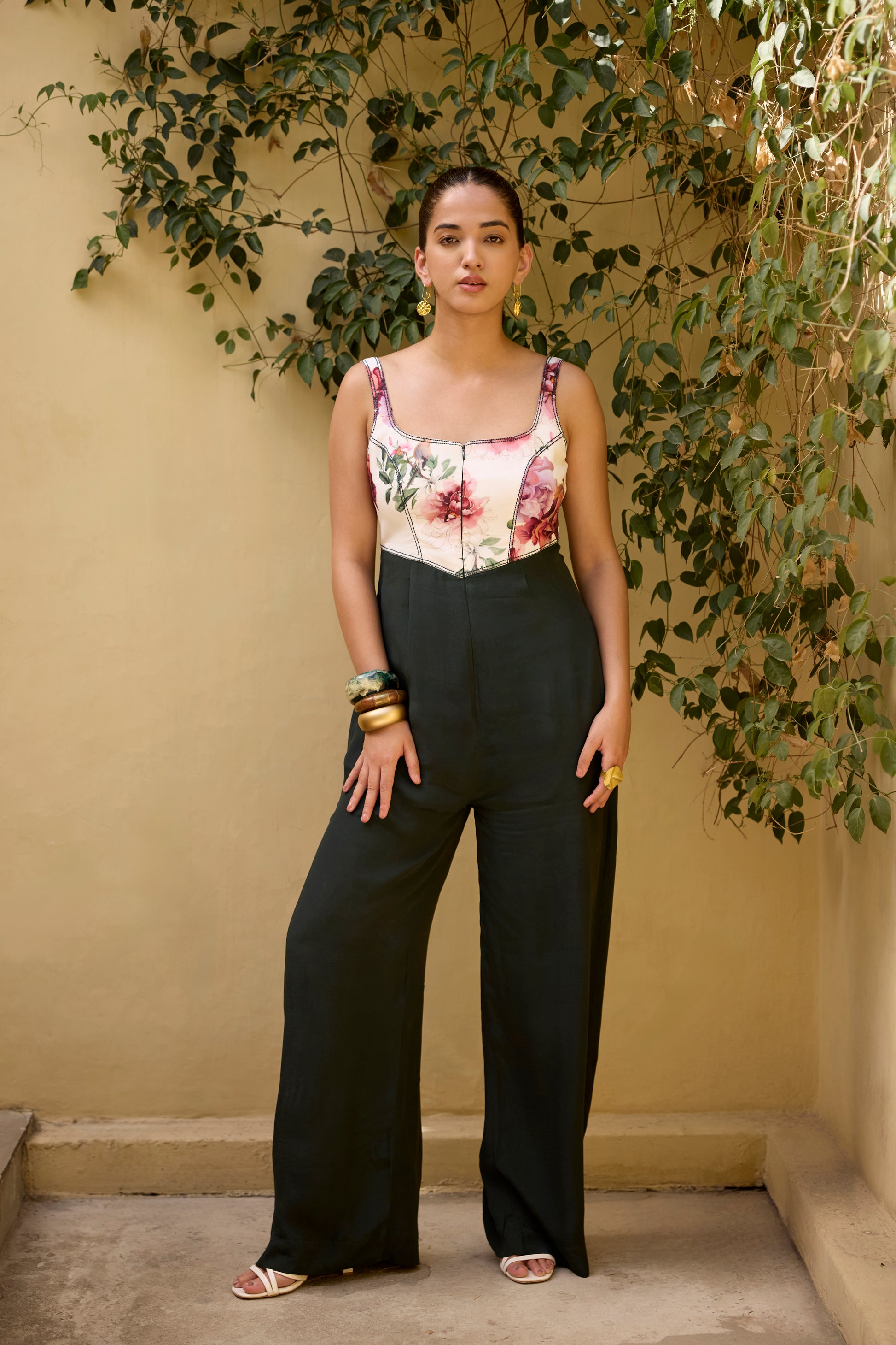 This sleeveless jumpsuit features a fitted corset-inspired bodice, crafted with floral printed panels and delicate seam detailing that accentuate the waist and bust for a flattering, sculpted silhouette. A center front zipper not only adds a functional element, making it easy to wear. Whether you're heading to a summer event or a stylish evening outing, this piece pairs beautifully with heels and bold accessories.