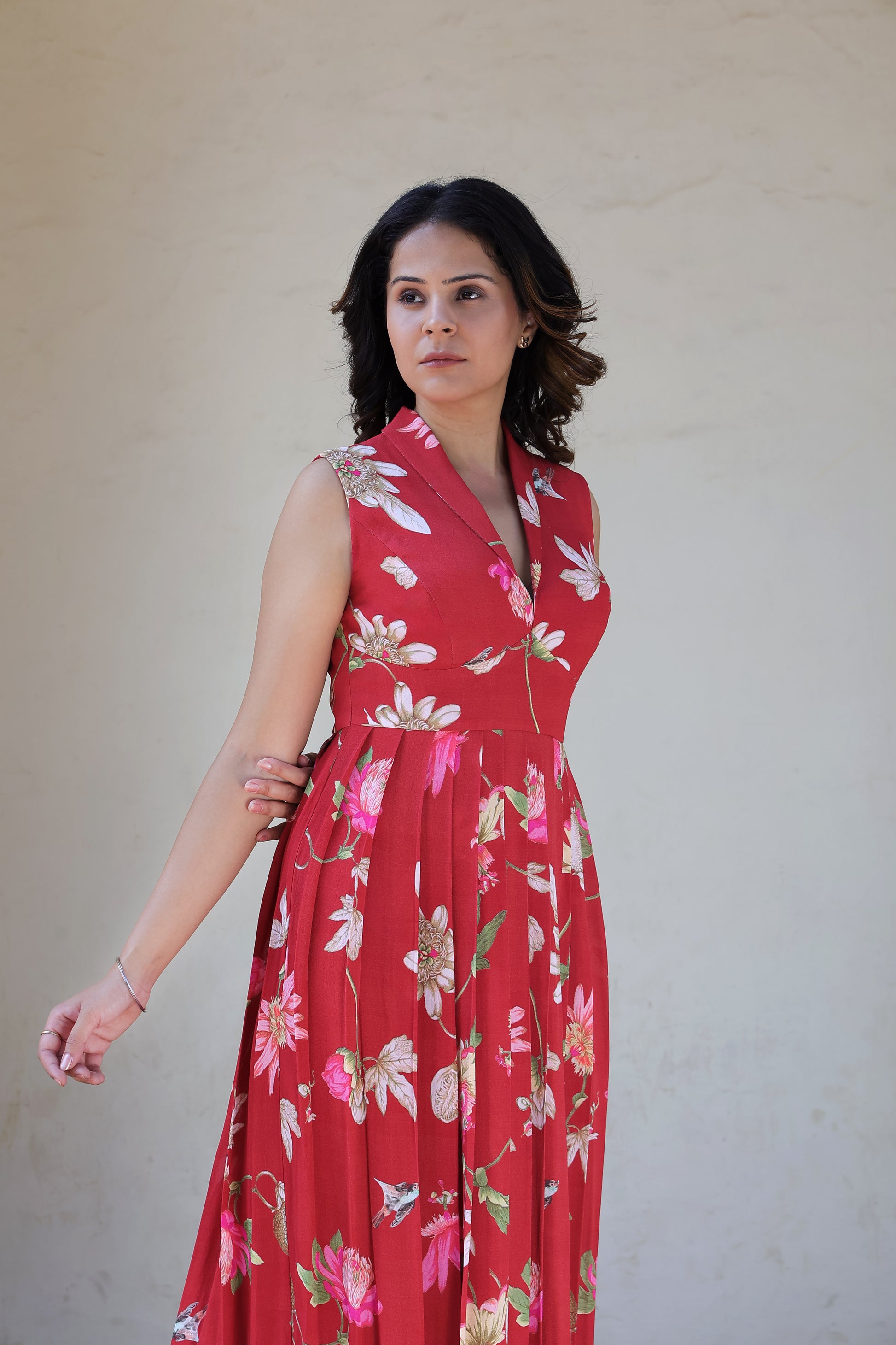 Enhance your style with this elegant floral sleeveless pleated long dress. The collar adds a touch of sophistication, making it suitable for various semi-formal and semi-casual events.