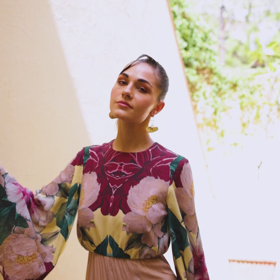 This sleeveless short dress has plunging V-neck and is crafted in cotton georgette with bold floral prints that flatter the torso, while the gathered flare is made from flowy natural crepe, in layers that create movement and ease. This dress is made for sunlit brunches, holiday strolls, or twirling poolside.